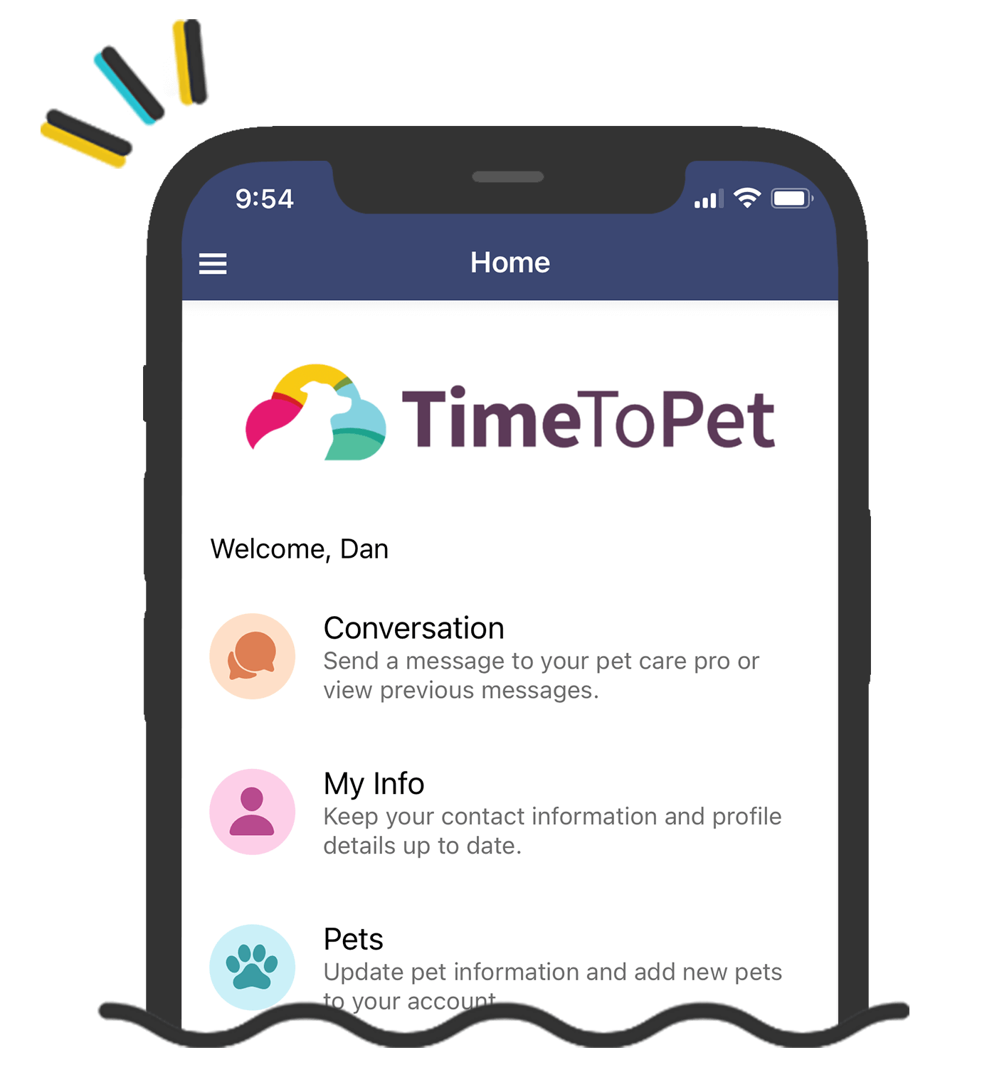 With Time To Pet, you can quickly request new services, check your scheduled visits, update your pet information, view and send messages to your sitter, and make payments.